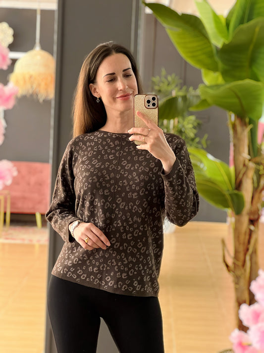 Jersey beige con lazos de terciopelo marrón – Talla única suave y elegante