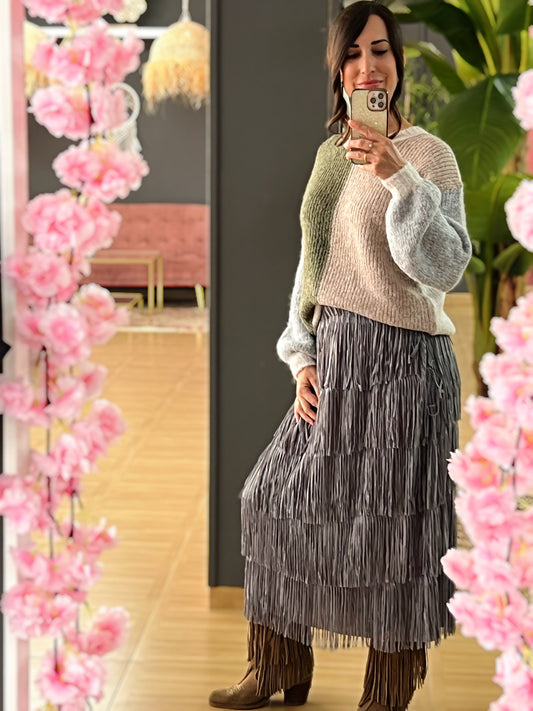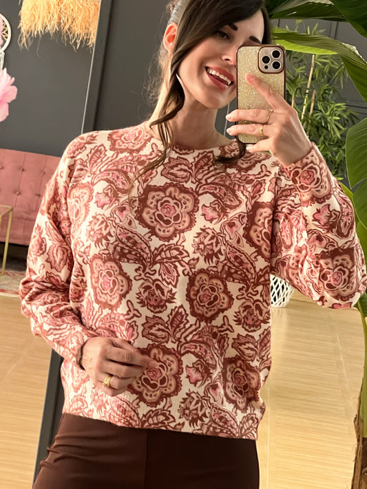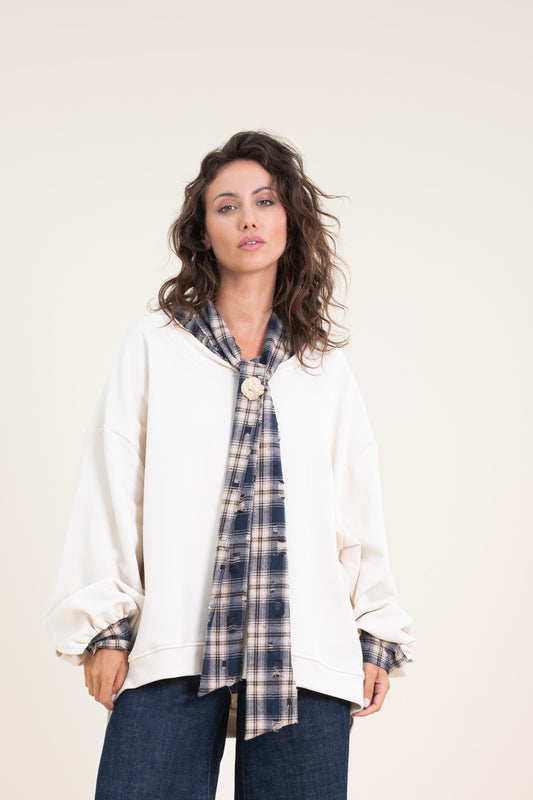 Jersey beige con lazos de terciopelo marrón – Talla única suave y elegante