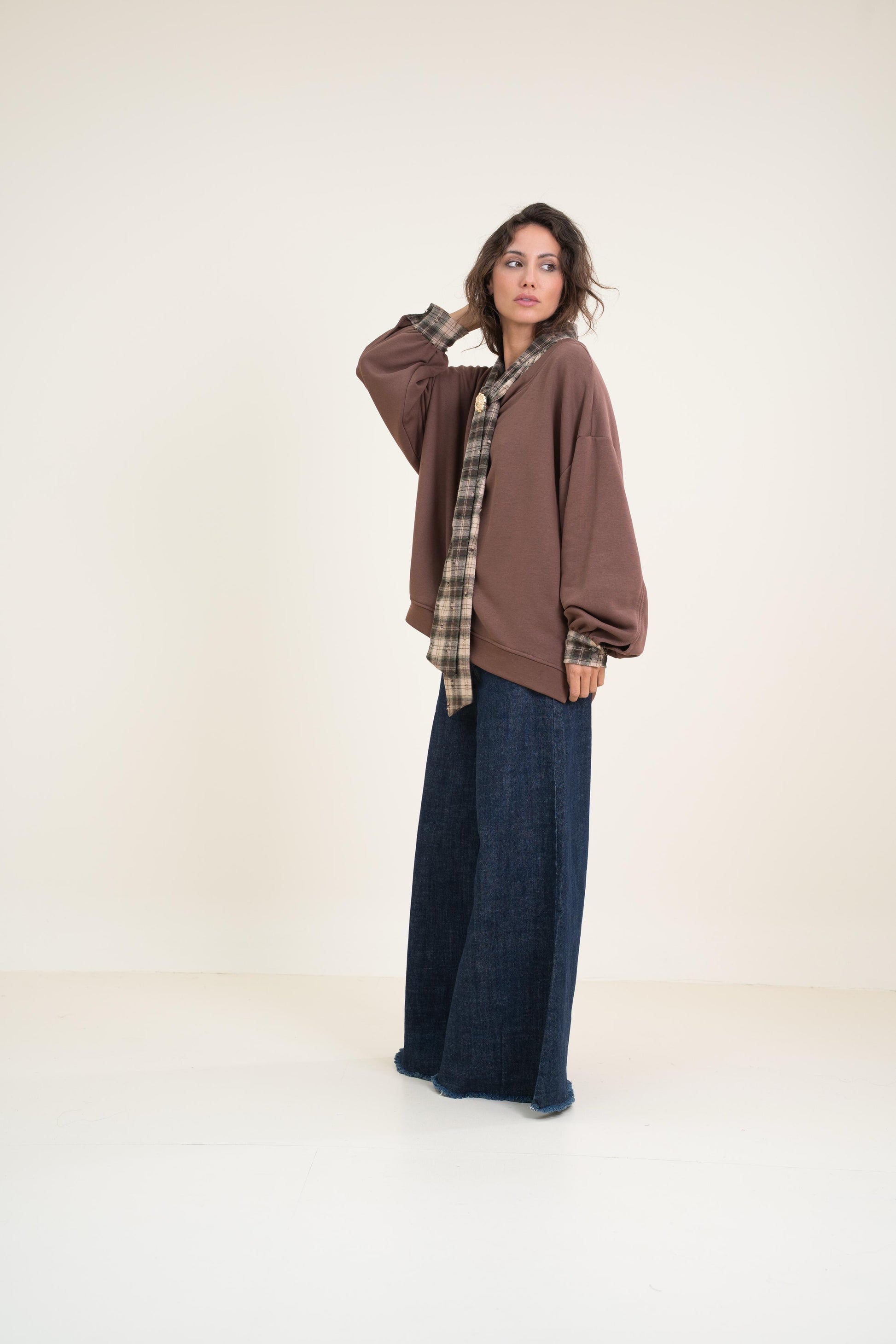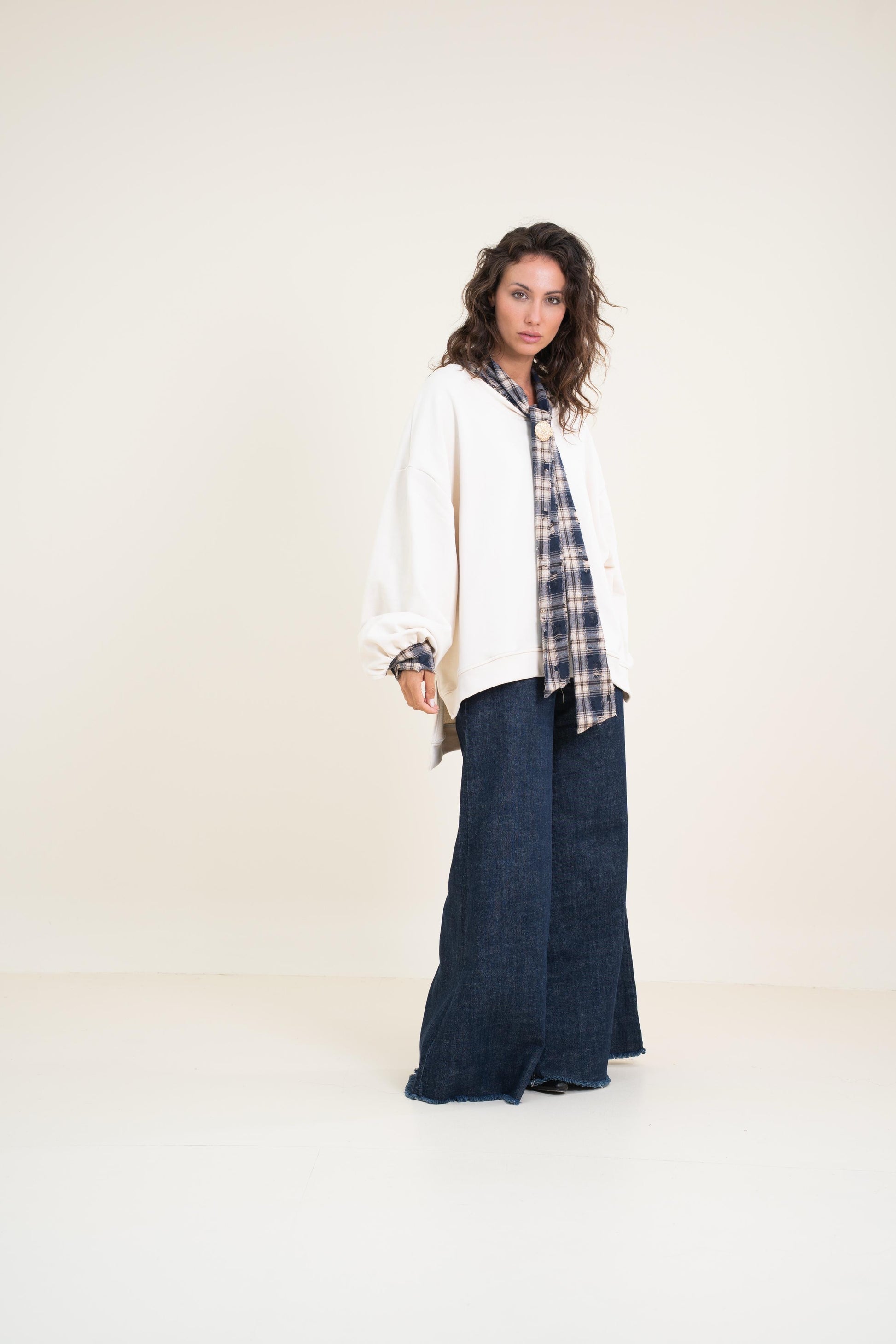 Confeccionada en tejido suave y elástico, presenta un diseño oversize con mangas abullonadas y detalles en cuadro vichy desgastado en el cuello y los puños. El lazo delantero con broche aporta ese aire femenino y diferente que marca la diferencia.